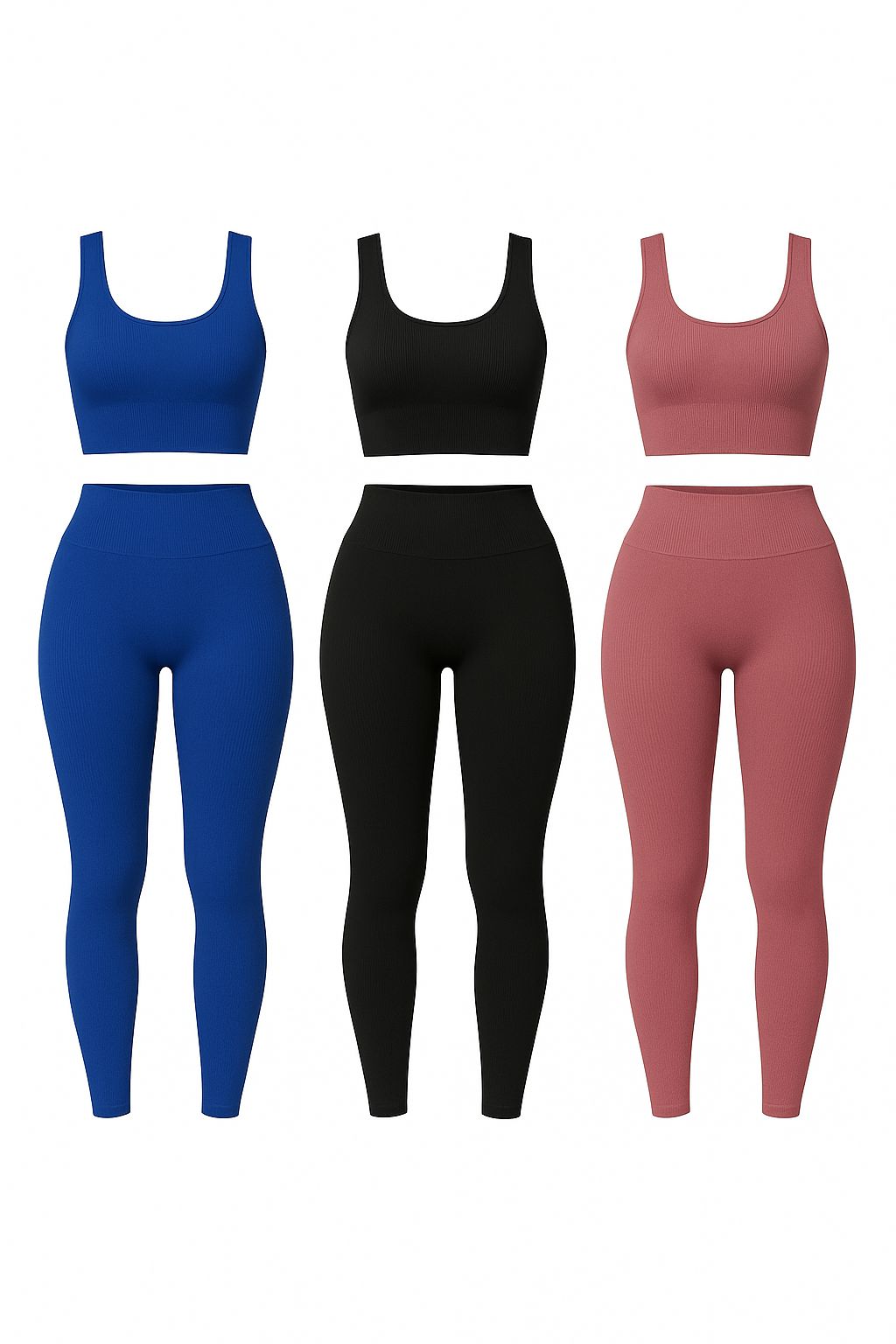 ثلاثة طقوم رياضية نسائية مكوّنة من 3 حملات صدر رياضية + 3 كولونات عالية الخصر، مصنوع من قماش مطاطي ، كيعطيك راحة تامة وحركة حرة خلال التمرين. تصميمه كيحدّد الجسم وكيعطي شكل أنيق بلا ضغط ولا انزعاج